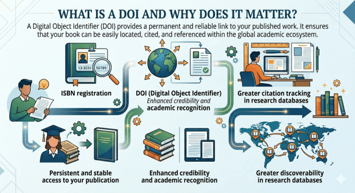 A Digital Object Identifier (DOI) provides a permanent and reliable link to your published work. It ensures that your book can be easily located, cited, and referenced within the global academic ecosystem.
